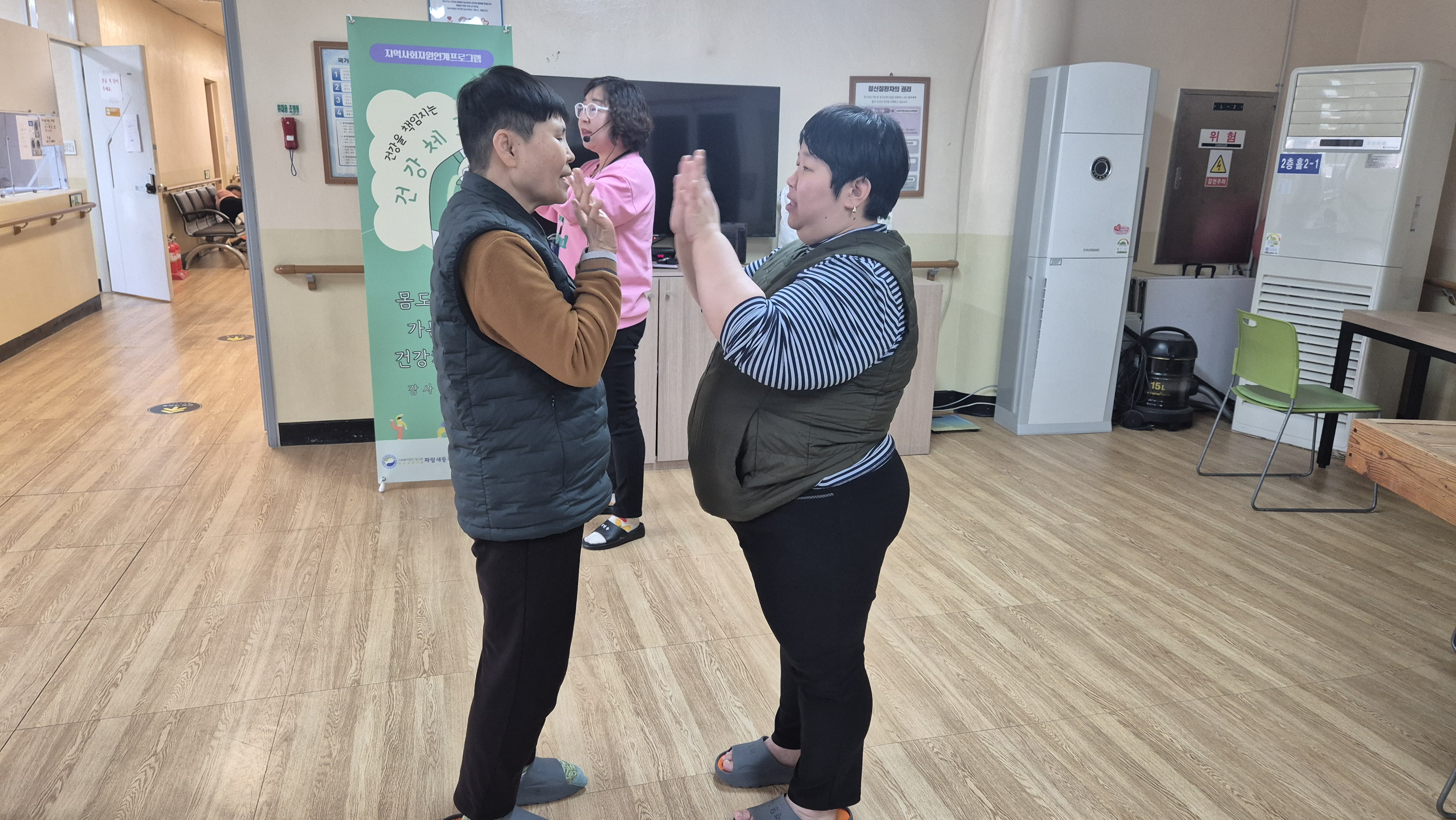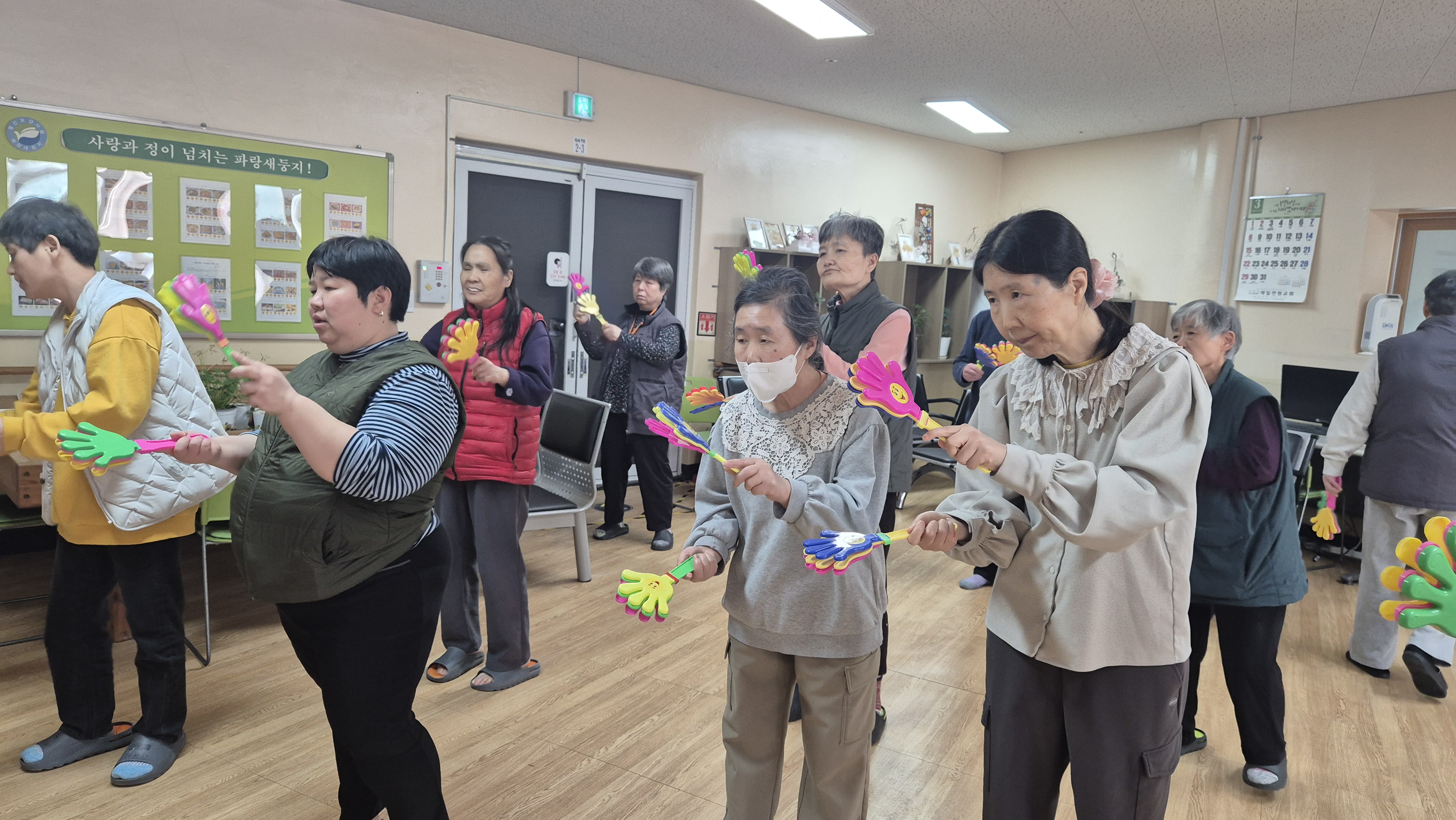 손 모양 짝짝이를 두드리며 신나는 트로트 음악에 맞춰 몸을 움직이니 자연스럽게 웃음꽃이 피어났습니다.