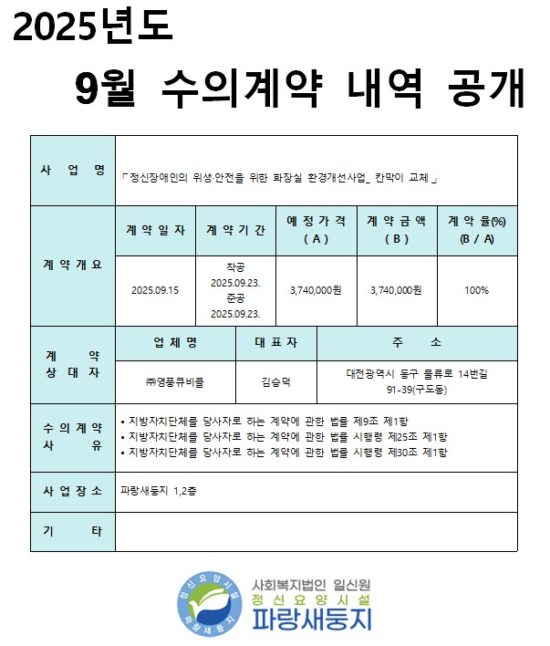 지방자치단체를 당사자로 하는 계약에 관한 법률 시행령 제31조에 의거하여 파랑새둥지 2025년 8월 9월 수의계약 내역을 붙임과 같이 공개합니다.